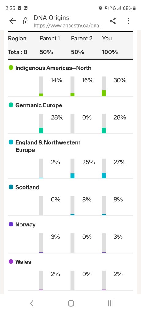 I had hoped I was closer to 50% Indigenous. With the results I got, everything feels pointless. I am white-passing, that is harmful enough, but knowing with 100% certainty that I am predominately Caucasian? Ouch. I feel like I am intruding upon a culture that isn’t really mine. I am no better than the asshole psychology teacher at TRU that thinks he can get away with his bullshit because he has some distant Cherokee grandmother or something of that business. I am no better than the white savior trope of those old movies like Dances with Wolves. It hurts. I am status and I grew up learning Secwépemc culture, but how can I truly belong if I am less than 1/3 native, only 14% Secwépemc and 16% St’at’imc? I feel like an imposter.